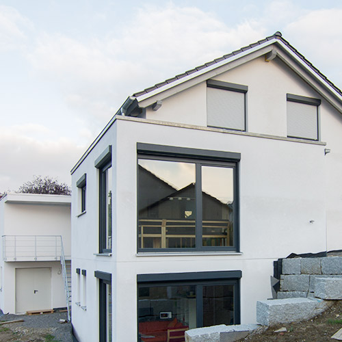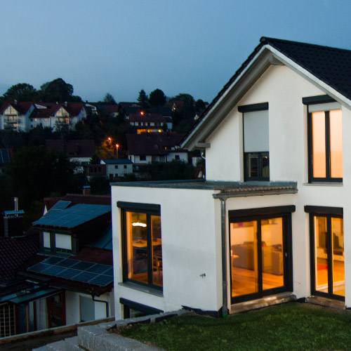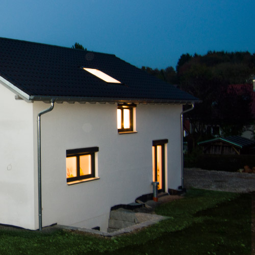 Einen Panoramablick nach Nord-Westen über die Stadt zu ermöglichen und gleichzeitig einen hohen Energiestandard zu gewährleisten, war die Entwurfsaufgabe für dieses Projekt. Dabei sind moderne Gestaltungselemente bei sehr klassischen Bauvorschriften für die vorhandene Baulücke realisiert worden. Das Ergebnis ist ein sehr schönes Wohnhaus, das sich harmonisch in die Siedlung einfügt, dabei aber mit seinem Flachdachanbau und weiteren Gestaltungselementen sehr modern erscheint. Die Wohnbereiche bieten einen herrlichen Ausblick über die Stadt – und das über alle Geschosse! So lässt sich auch die Einliegerwohnung im Untergeschoss bestens vermieten. Die sichtbaren Holzoberflächen für Böden und Decken bieten eine gemütliche und warme Atmosphäre mit bestem Raumklima, unterstützt von unserer hochwertigen Massiv-Holz-Mauer. Dabei garantiert die hohe Wärmedämmung kombiniert mit der intelligenten Gebäudetechnik extrem niedrige Heizkosten.